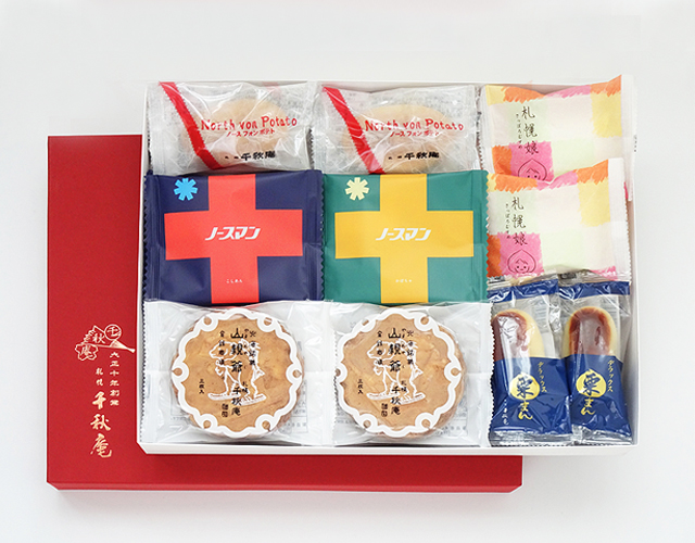 一冊の歴史物語の本に見立てた箱に、札幌にちなんだ千秋庵自慢のお菓子を詰め合わせました。贈り物として、お土産としても喜ばれております。 ※詰め合わせ内容は、箱の入数により異なります。 詳しくはオンラインショップをご覧ください。