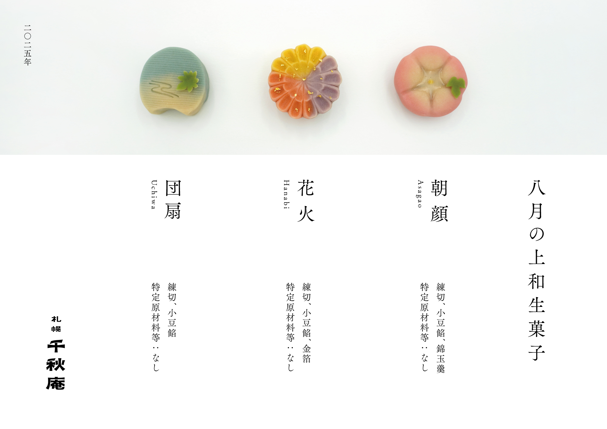 2025年08月01日 八月の上和生菓子(本店限定) 札幌千秋庵本店では、毎月の季節の上和生を販売しています。 【価格】1個 330円(税込) 【販売期間】8月1日~ 【販売店舗】札幌千秋庵本店 限定 ※数量限定のため売切の際は予めご了承ください。 ※詳細につきましては、札幌千秋庵本店までご連絡お願いいたします。 本店 TEL 011-205-0207(10:00~18:00)