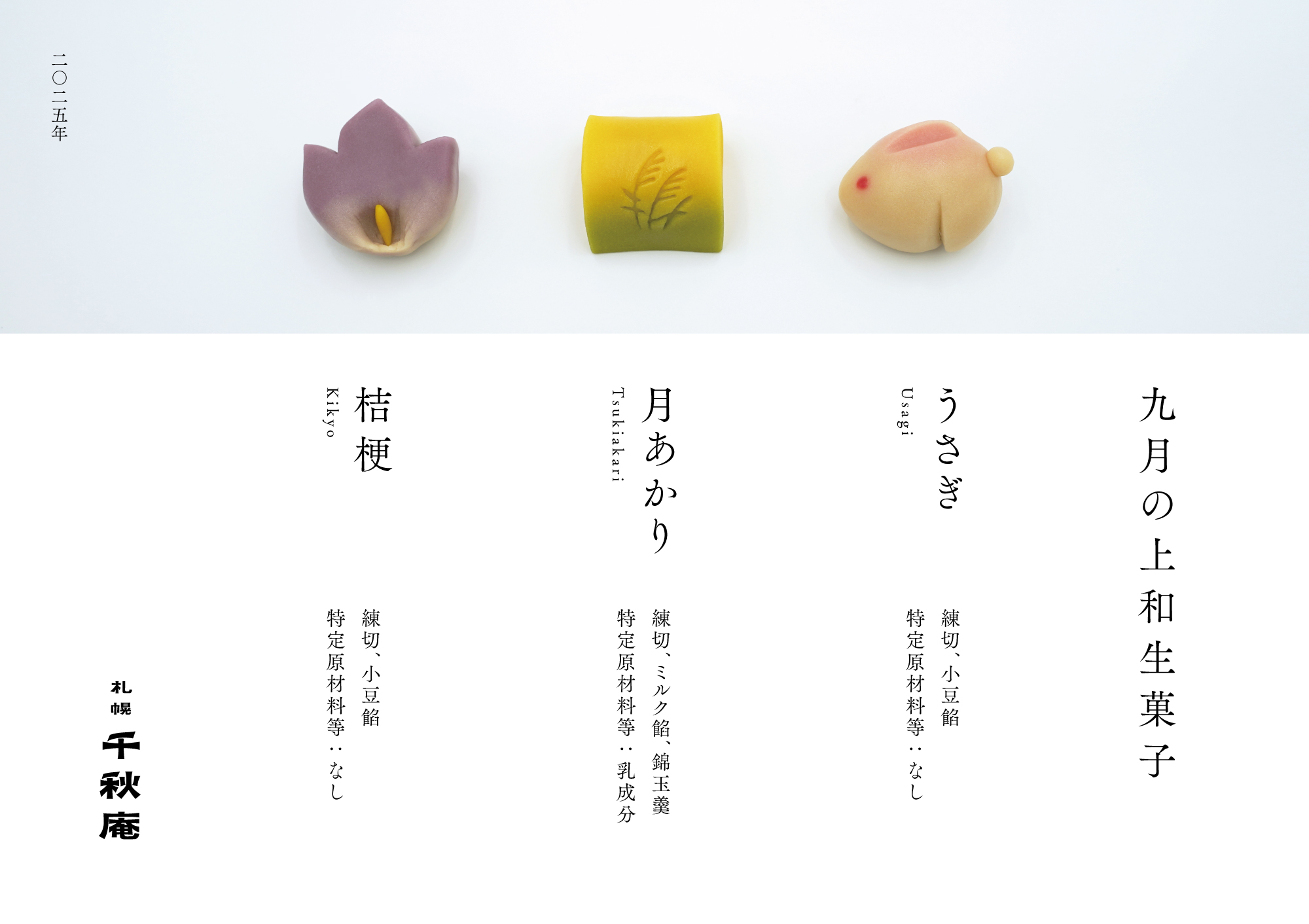 2025年09月01日 九月の上和生菓子(本店限定) 札幌千秋庵本店では、毎月の季節の上和生を販売しています。 【価格】1個 330円(税込) 【販売期間】9月1日~ 【販売店舗】札幌千秋庵本店 限定 ※数量限定のため売切の際は予めご了承ください。 ※詳細につきましては、札幌千秋庵本店までご連絡お願いいたします。 本店 TEL 011-205-0207(10:00~18:00)