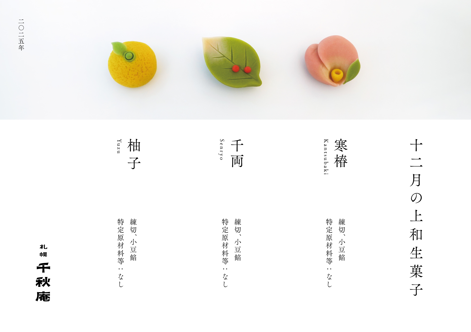 2025年12月01日 十二月の上和生菓子(本店限定) 札幌千秋庵本店では、毎月の季節の上和生を販売しています。 【価格】1個 330円(税込) 【販売期間】12月1日~ 【販売店舗】札幌千秋庵本店 限定 ※数量限定のため売切の際は予めご了承ください。 ※詳細につきましては、札幌千秋庵本店までご連絡お願いいたします。