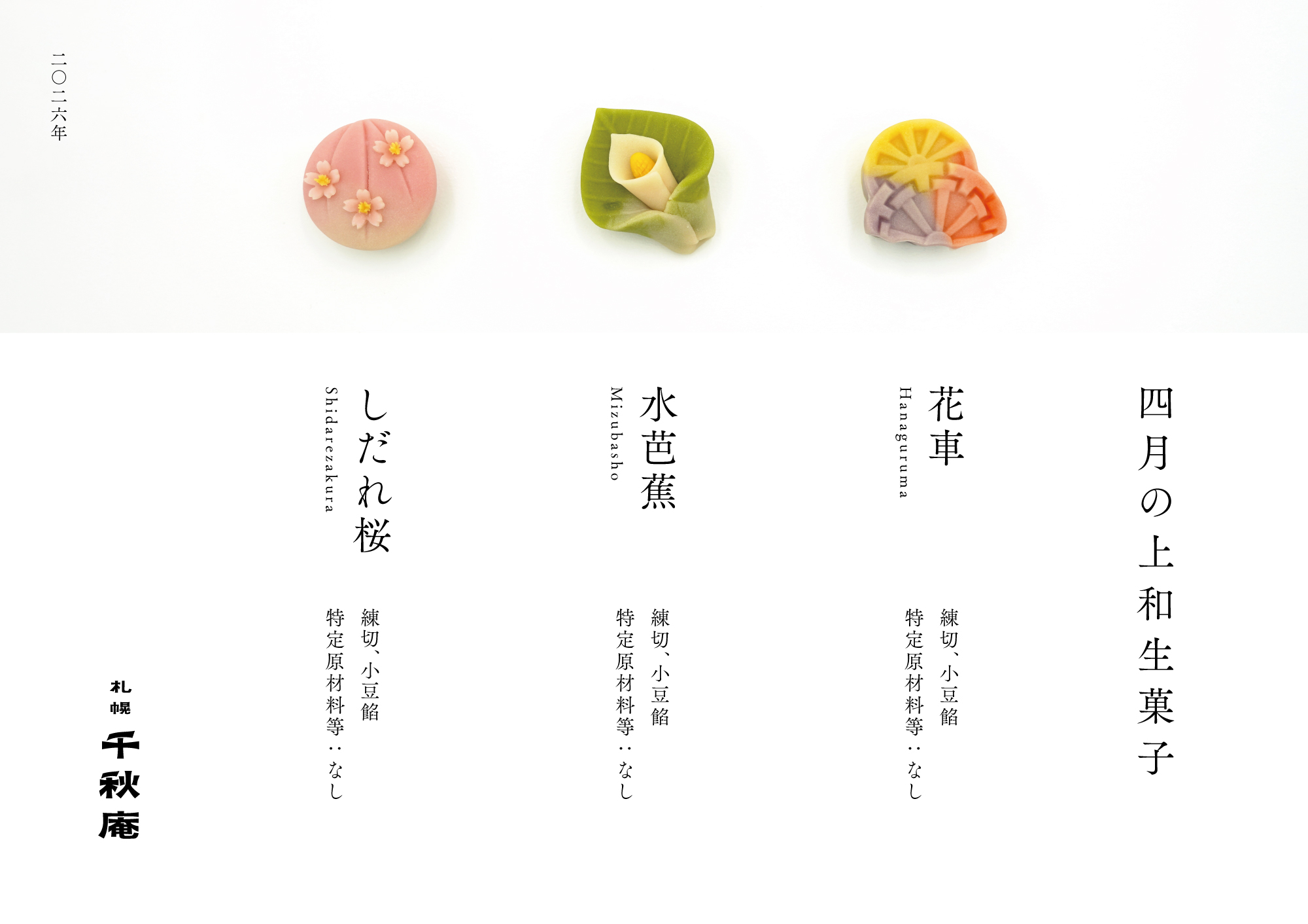 2026年04月01日 四月の上和生菓子(本店限定) 札幌千秋庵本店では、毎月の季節の上和生を販売しています。 【価格】1個 330円(税込) 【販売期間】4月1日~ 【販売店舗】札幌千秋庵本店 限定 ※数量限定のため売切の際は予めご了承ください。 ※詳細につきましては、札幌千秋庵本店までご連絡お願いいたします。