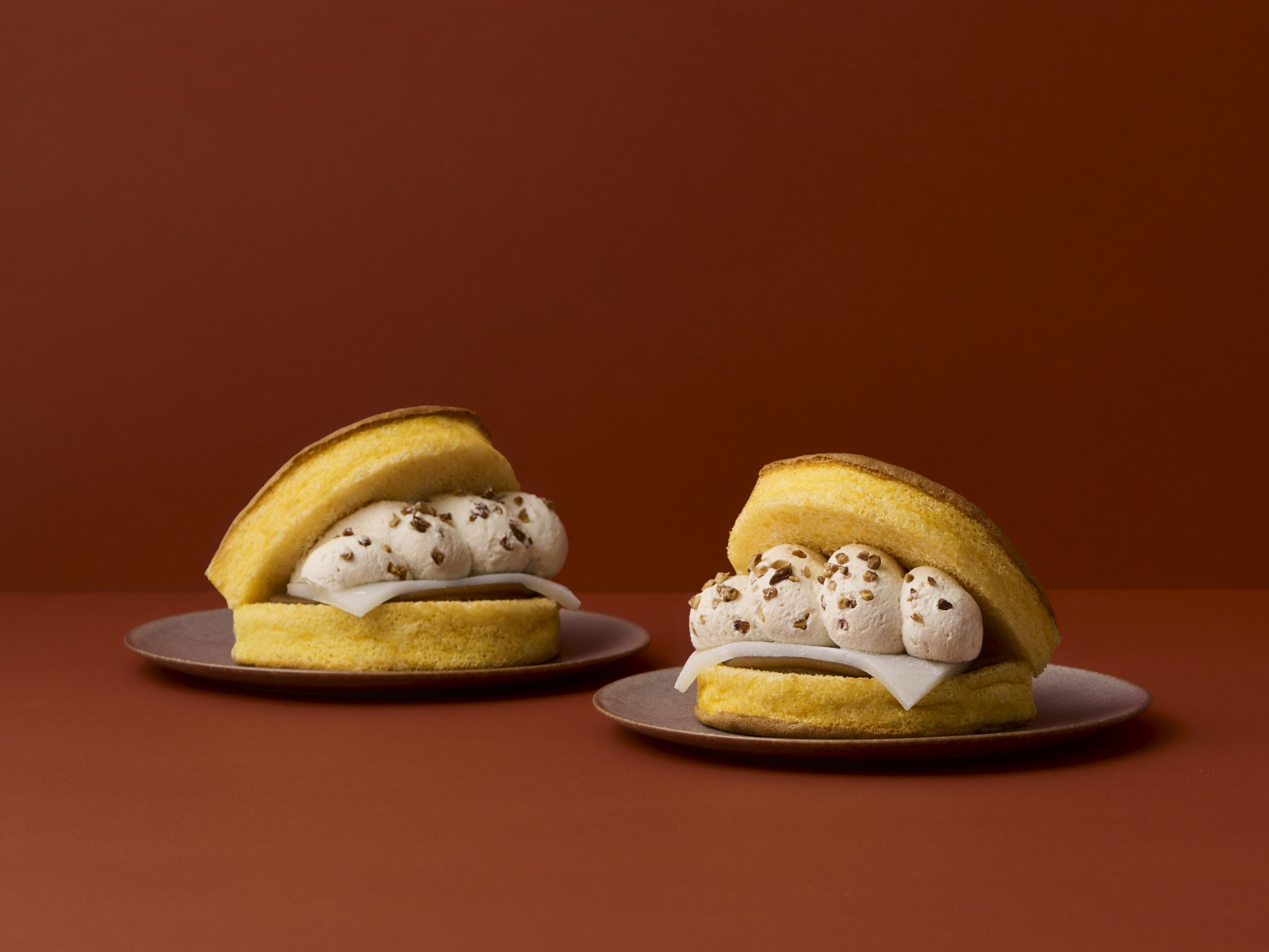 甘さを抑えた濃厚なキャラメルあんと、絹のようになめらかな求肥、キャラメル風味の生クリームを挟みました。